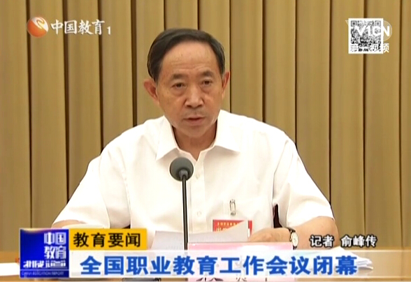 6月24日,全國(guó)職業(yè)教育工作會(huì)議在京閉幕。受國(guó)務(wù)院委托,教育部黨組書記、部長(zhǎng)袁貴仁代表職業(yè)教育工作部際聯(lián)席會(huì)議六部門作會(huì)議總結(jié)。(圖片來源:中國(guó)教育電視臺(tái))