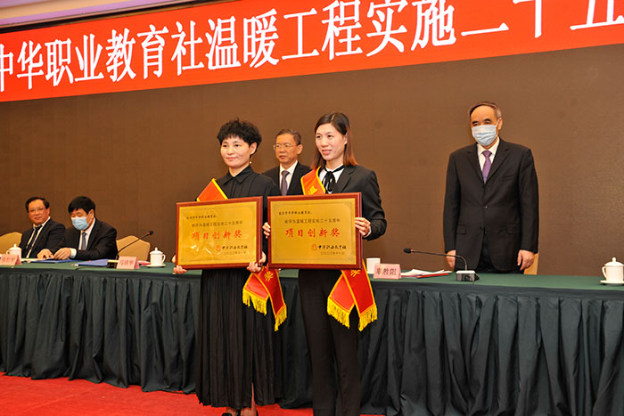 全國人大常委會副委員長、中華職業(yè)教育社理事長郝明金,全國政協(xié)副主席、中華職業(yè)教育社副理事長辜勝阻向溫暖工程項目創(chuàng)新獎獲獎者頒發(fā)銅牌